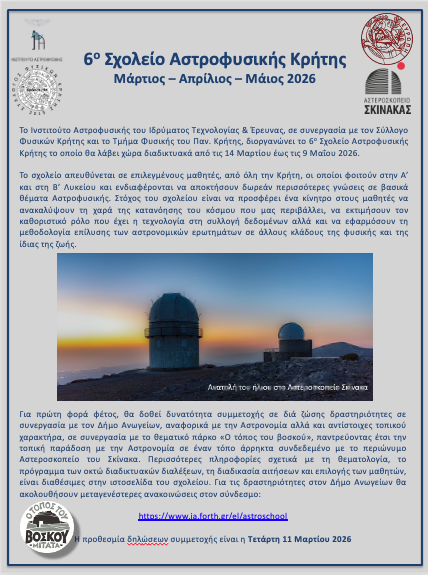 The Institute of Astrophysics of FORTH is pleased to announce the launch of the 6th School of Astrophysics of Crete, which will be organized online in collaboration with the Dept. of Physics of the Univ. of Crete and the Association of Physicists of Crete, from March to May 2026.